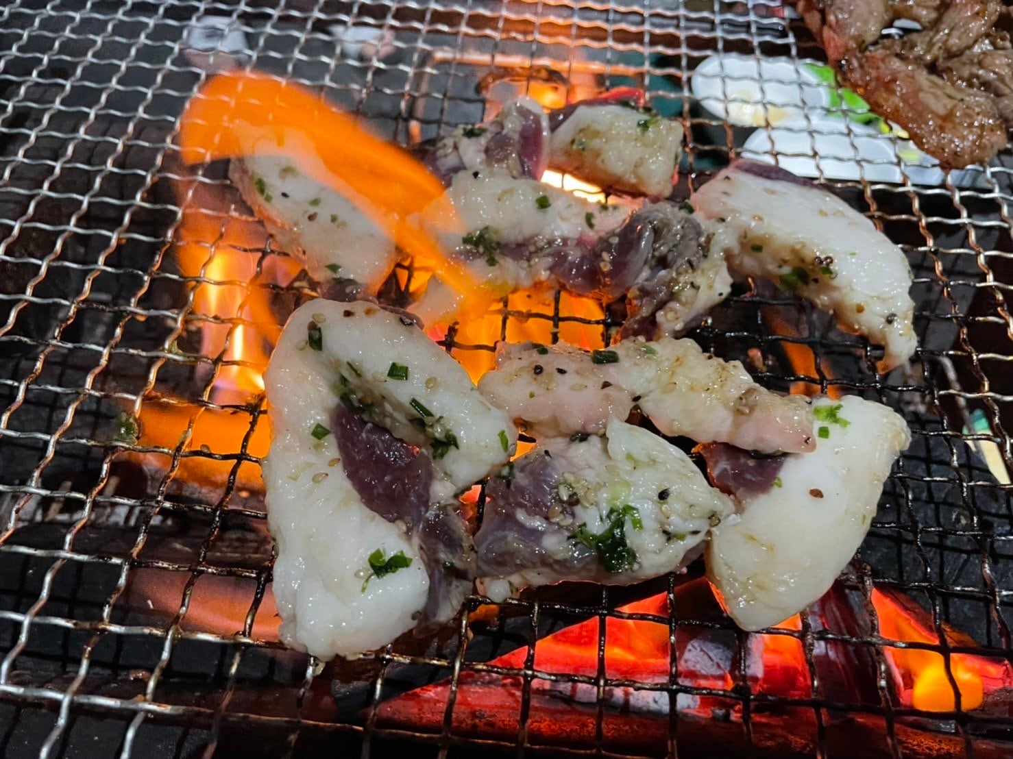 お肉の外側の筋膜は、細かくお肉を切り分けて焼くとき、口当たりの悪さから普通は剥がす部分になります。しかし、骨付きの塊肉を焼くときに関しては、その筋膜の部分を焼き切れるので逆にカリッとした鶏の皮のような存在になり良さに変わります。