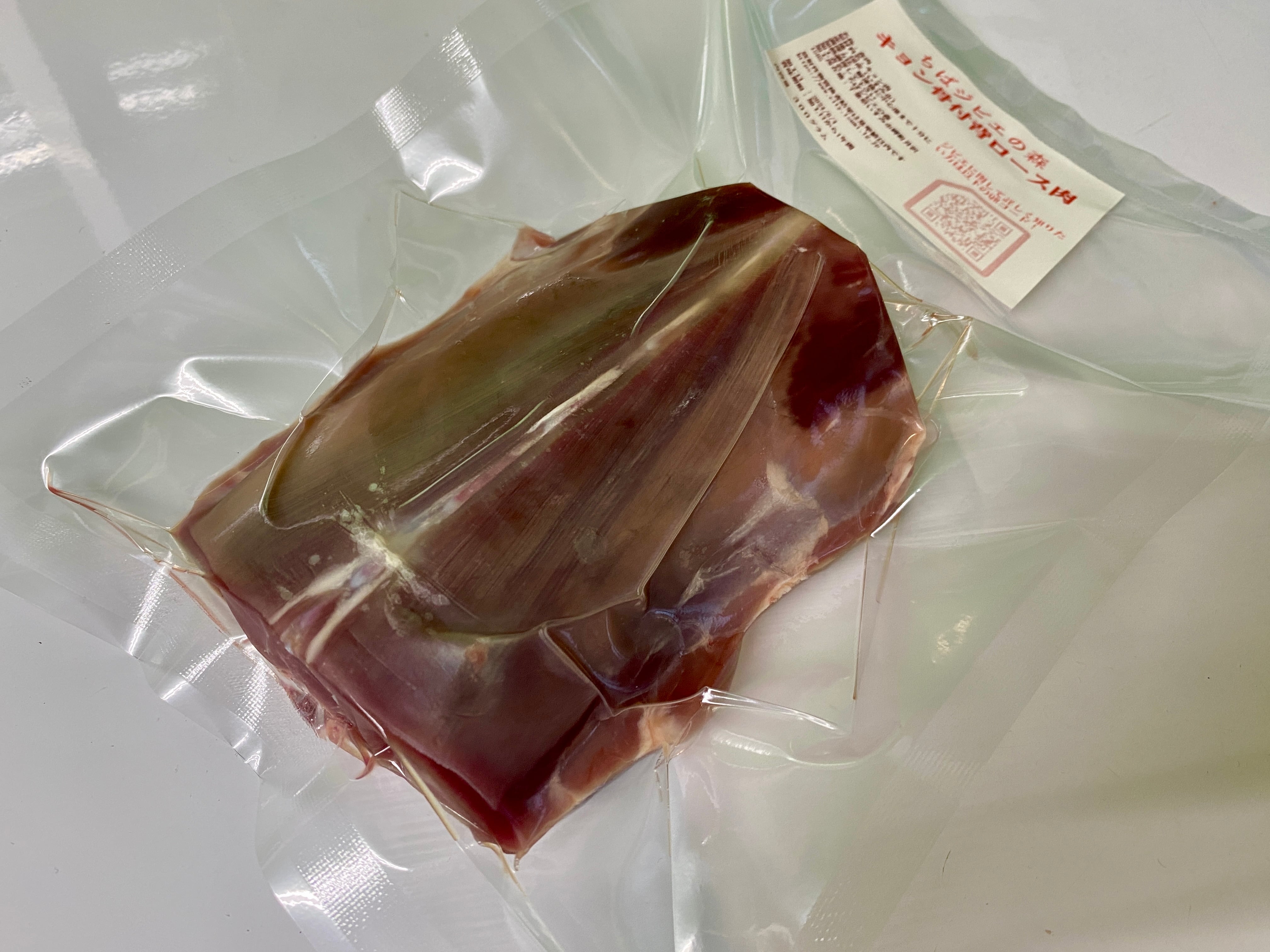 キョンの骨付背ロース肉310グラムとタヌキ骨付き肉560グラムのセットです。